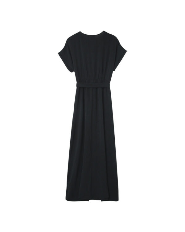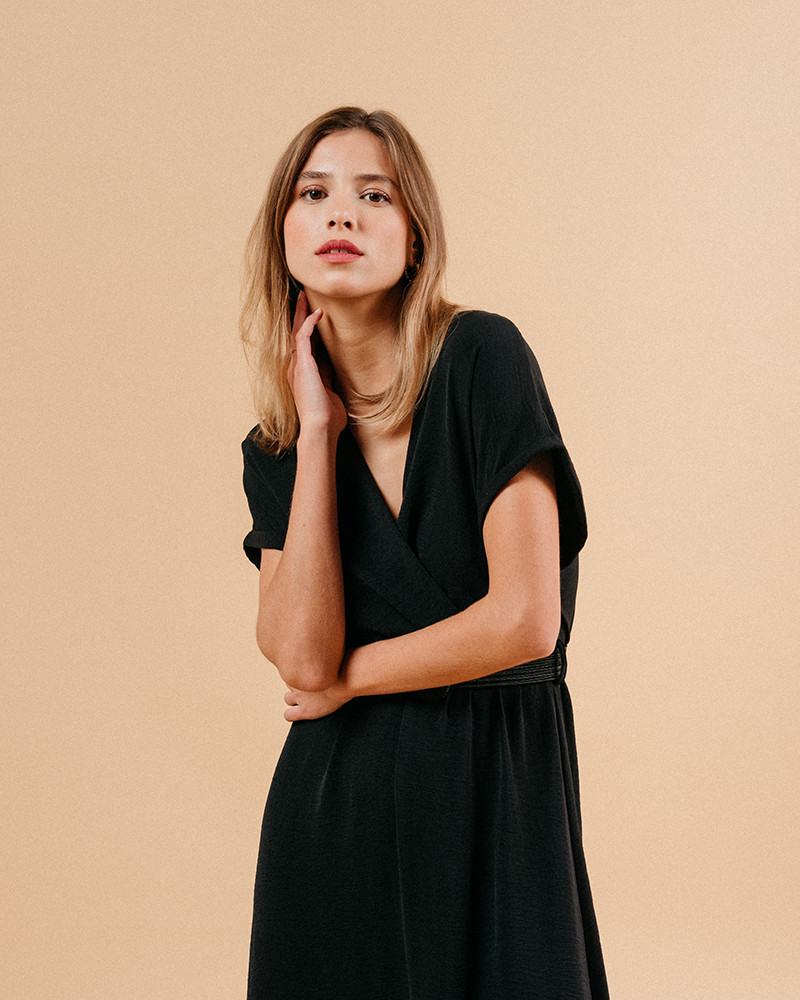 “MAUD is a maxi dress with a crossover neckline and short cuffed sleeves. It has an elasticated waist, belt loops and a detachable belt. The fit is relaxed.