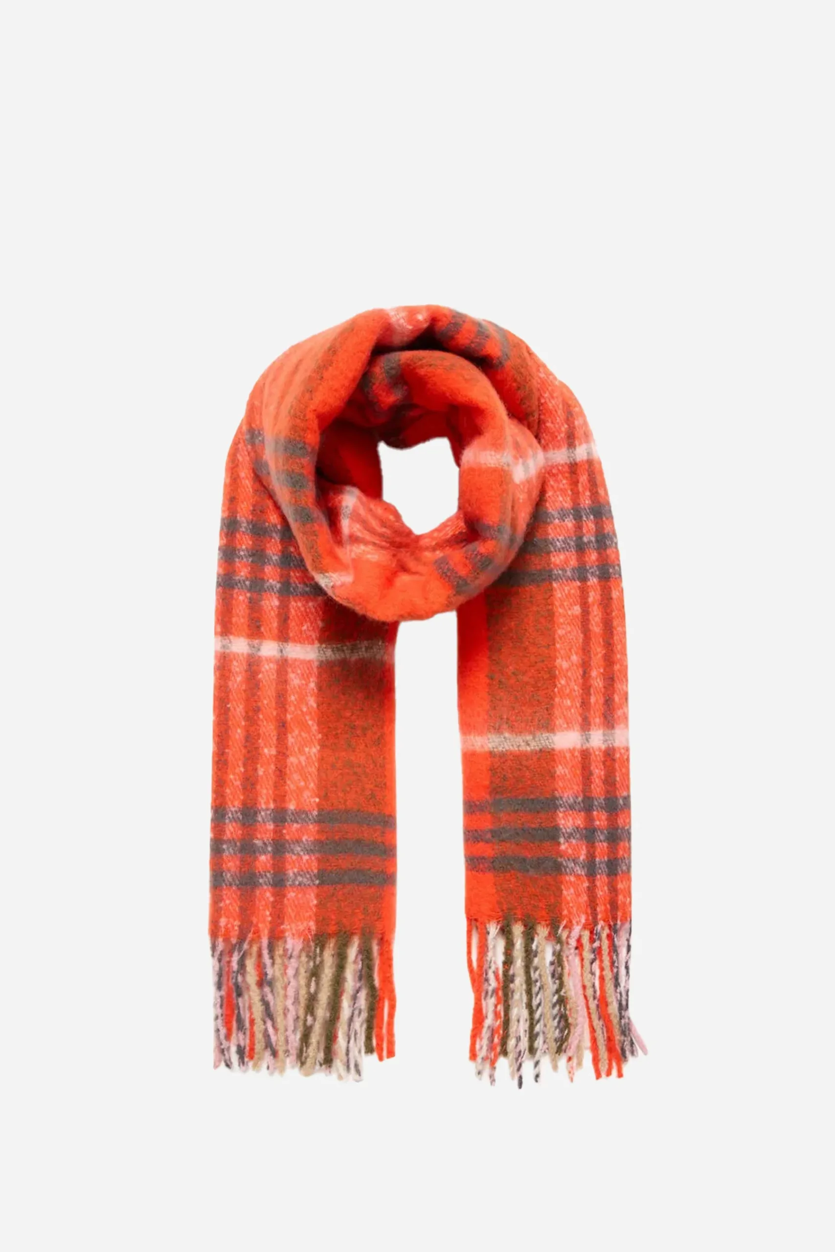 ICHI IAELMA checkered scarf in tangerine colour with fringes.