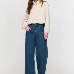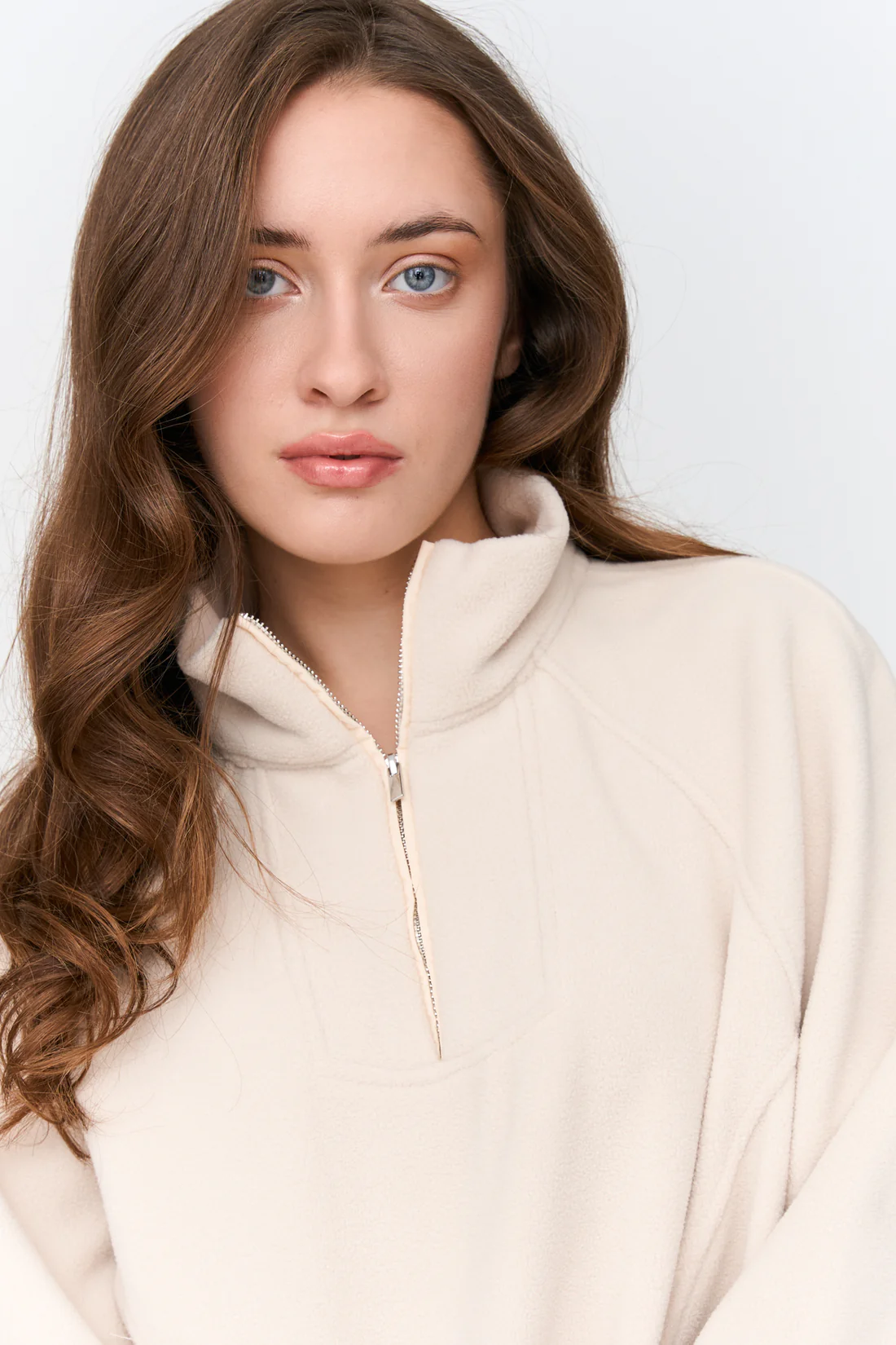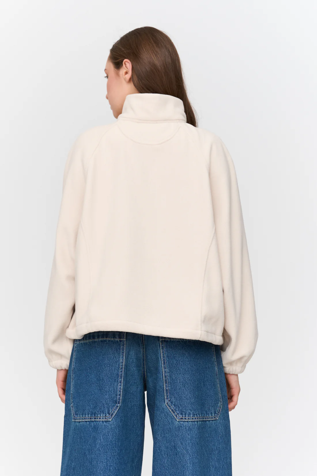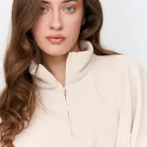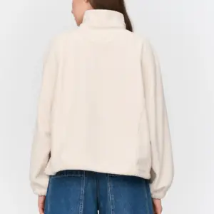 Off-white fleece top with high half zip collar and two front pockets. Elasticated cords for bottom fastening.