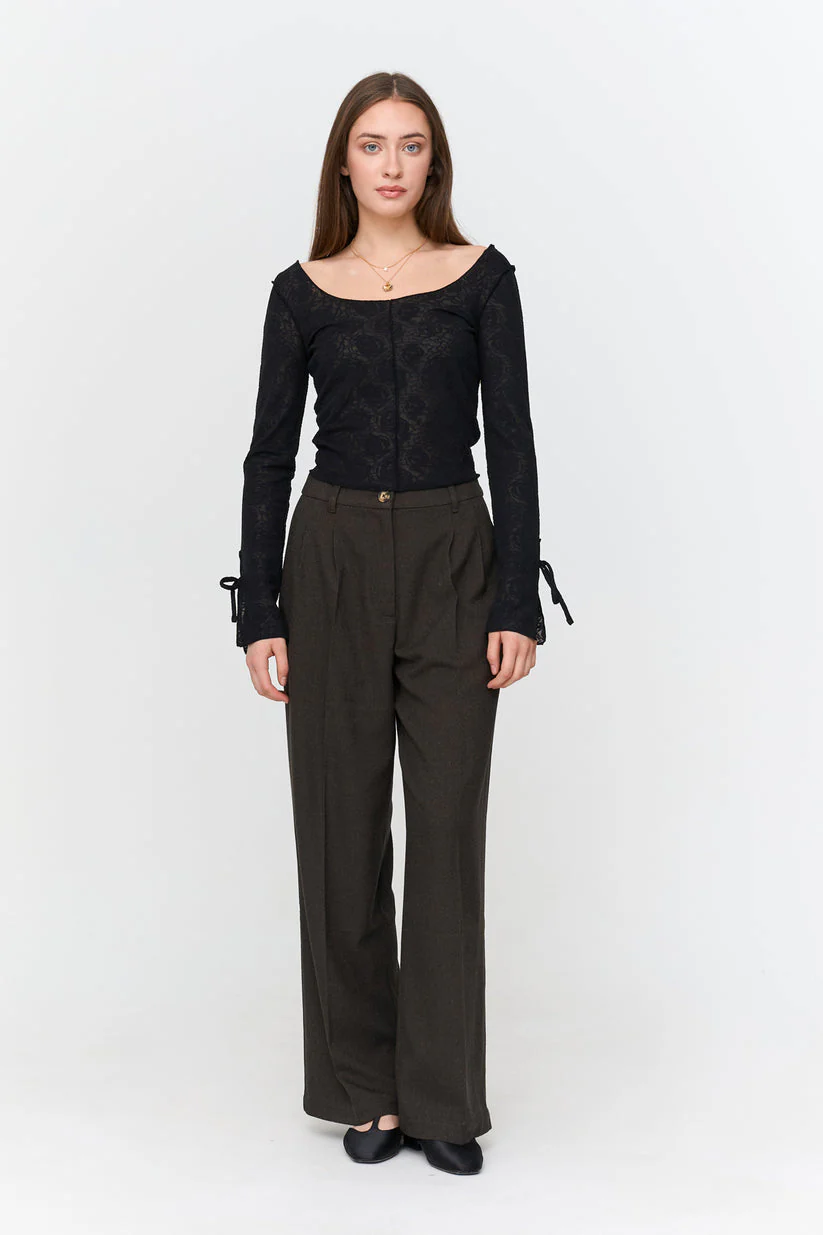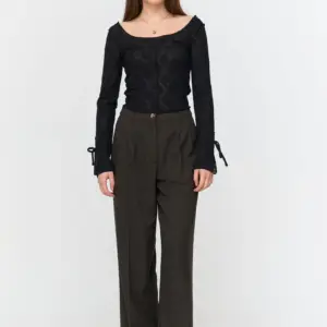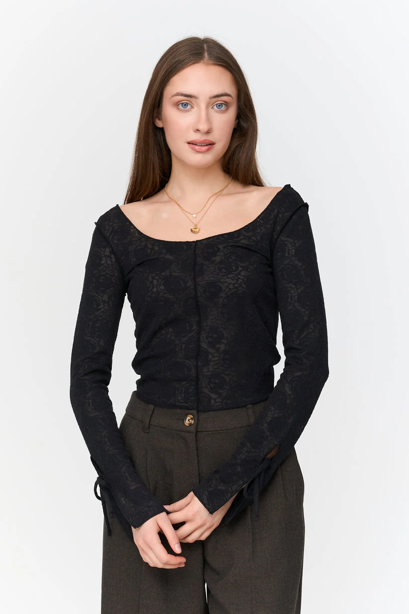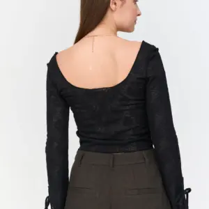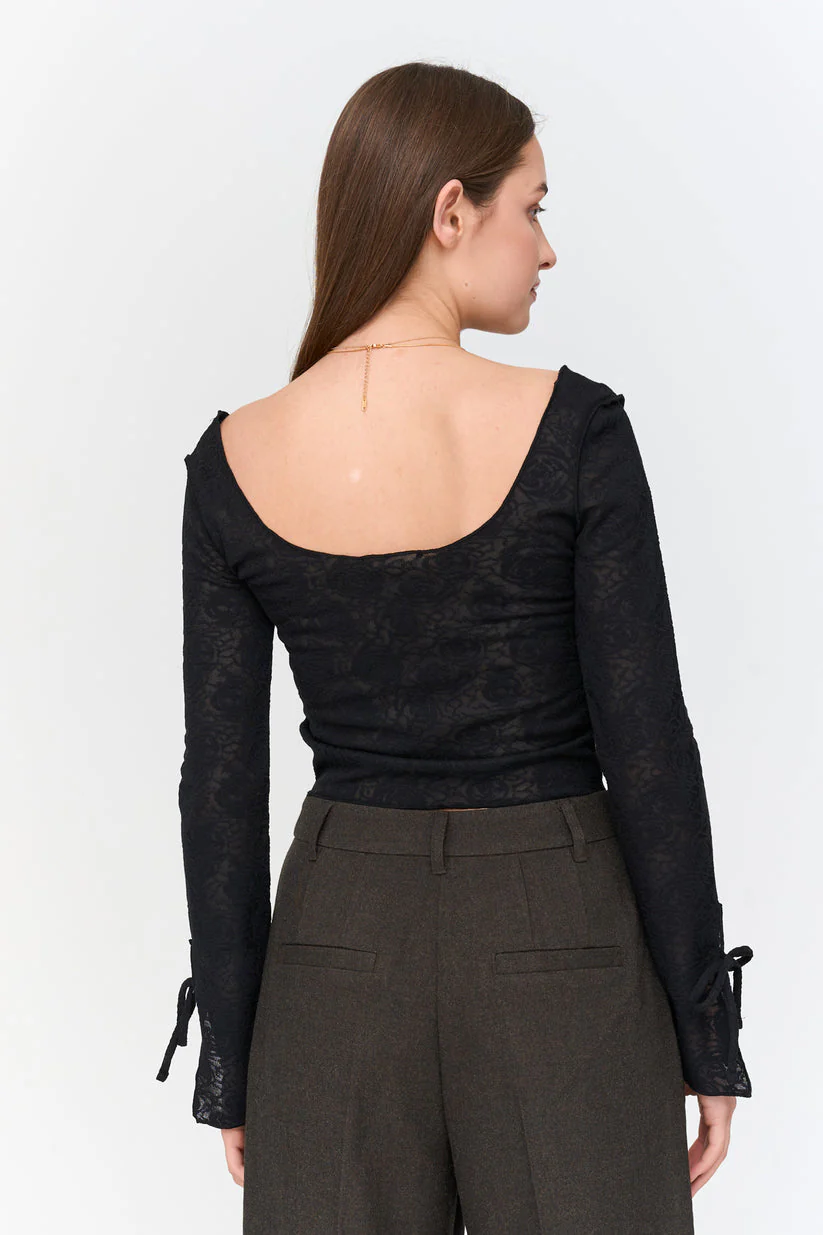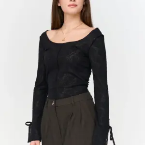 Tight and stretcy long sleeve lace top with wide front and back neckline and open sleeves.