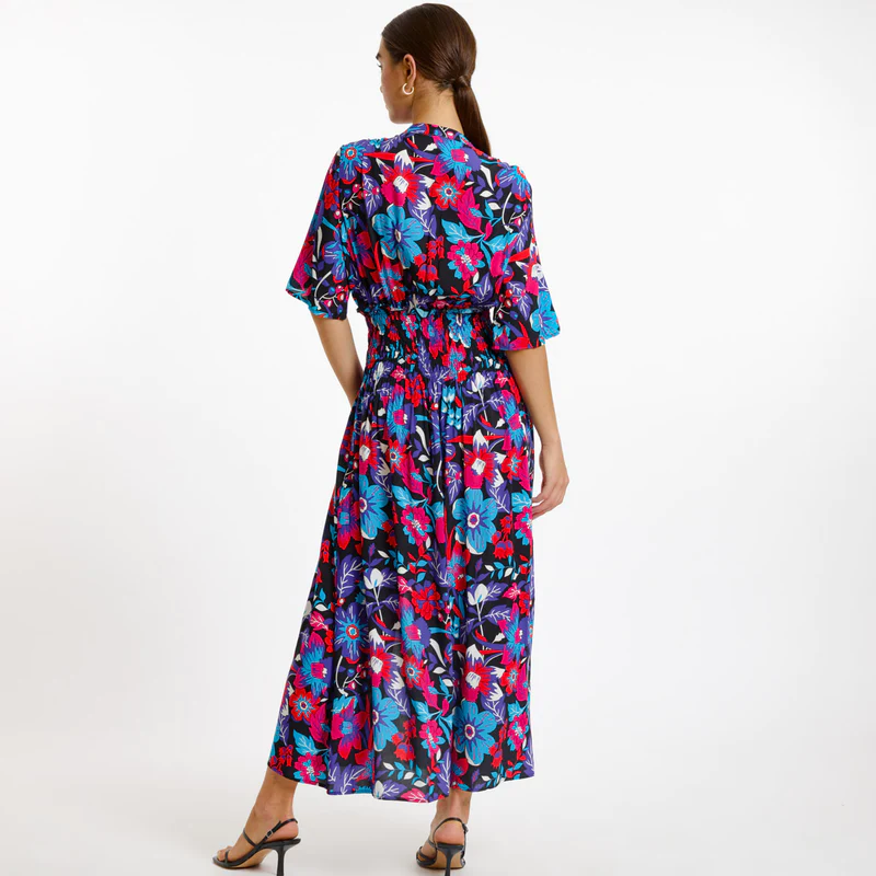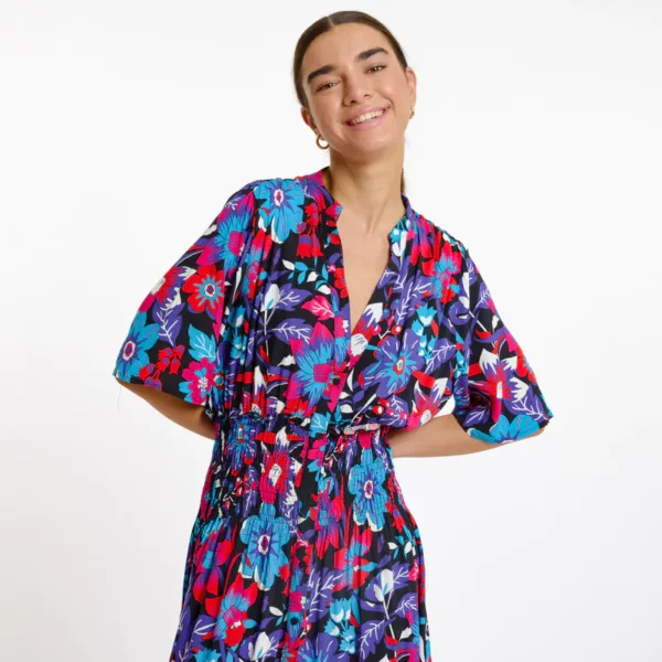 Short-sleeved dress, floral pattern, button placket, round neck, tightened waist