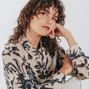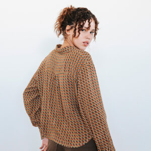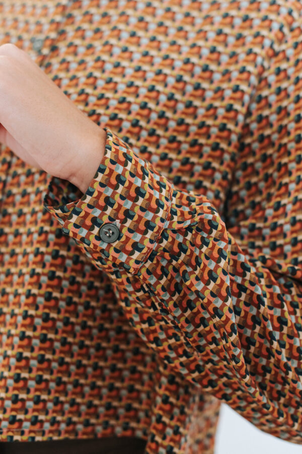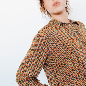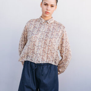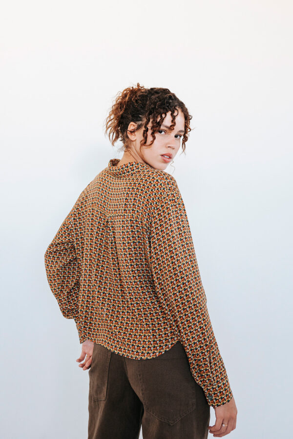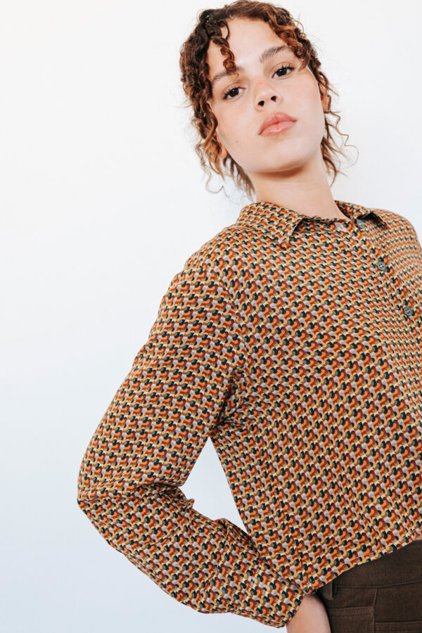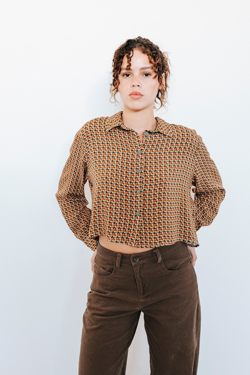 Printed cropped shirt with a collar and front button closure.