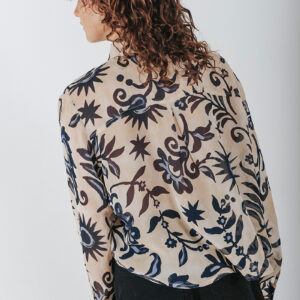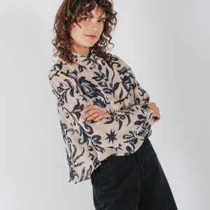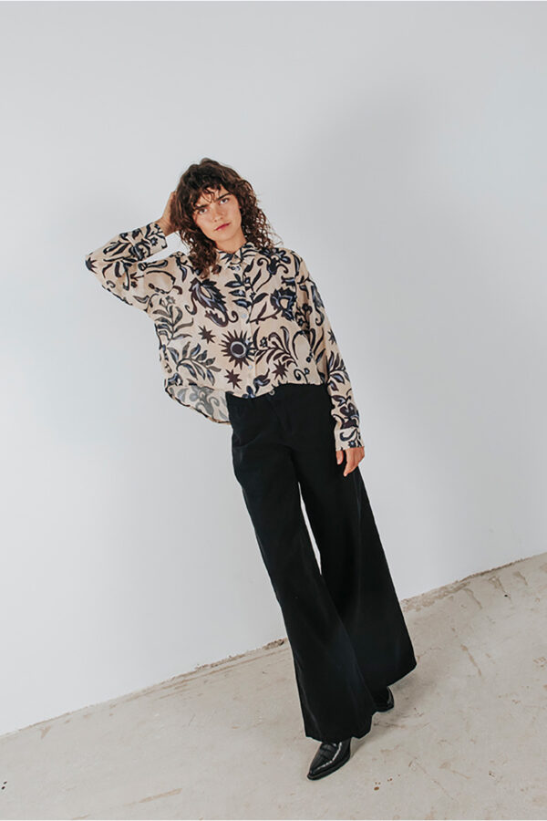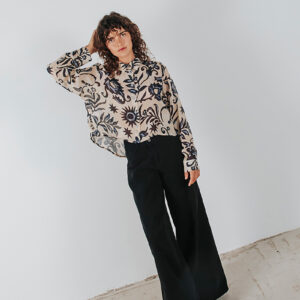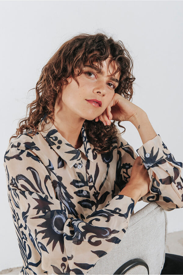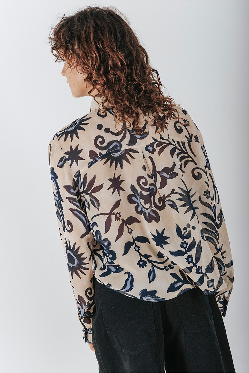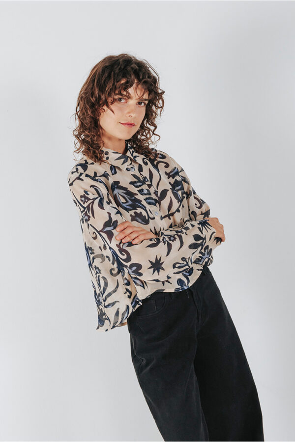 Printed see-through cropped shirt with a collar and front button closure.
