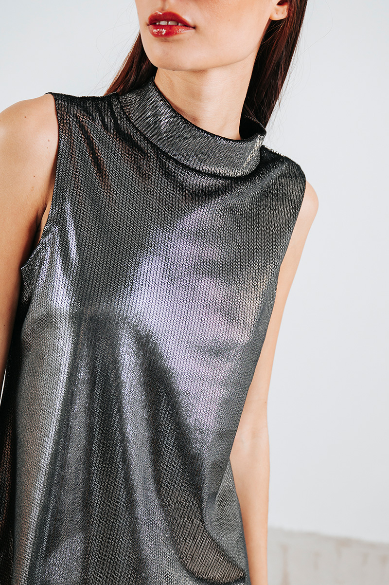 Mini sleevless shiny velvety dress with a high neckline.