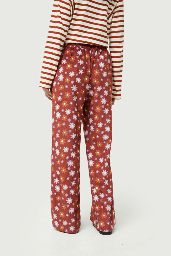 Corduroy pants with brown and lilac flower print. With a mid-rise elastic waist and straight leg. Side pockets.