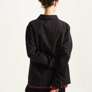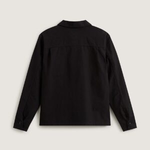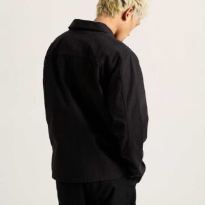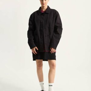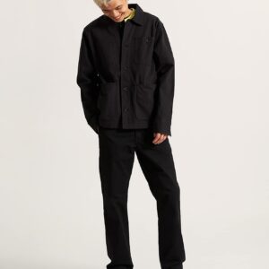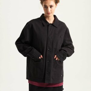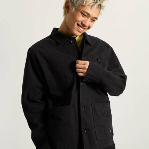 The Drill Chore Canvas Jacket is a 100% cotton canvas chore coat with patch pockets, a snap-front placket, and a woven logo patch.
